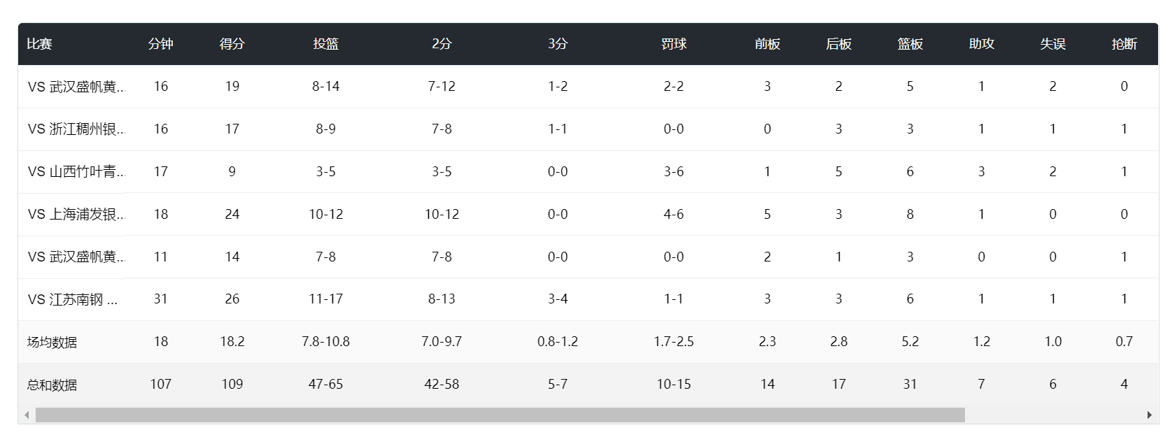 回顾全锦赛6场比赛,韩旭场均仅出战18分钟,却能贡献18.2分5.2篮板1.2助攻0.7抢断1.3盖帽的全面数据,命中率72.3%,三分命中率71.4%。由于第一阶段随中国女篮集训缺席,第二阶段回归后她迅速成为球队定海神针,尤其在李梦因身体不适后四场几乎未出战的情况下,韩旭的发挥更为关键。
