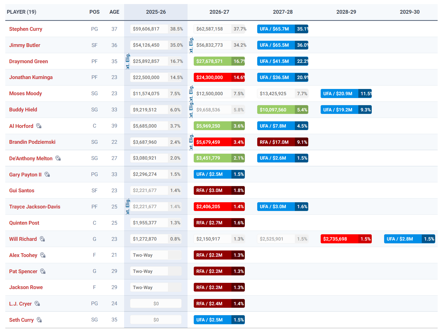 这套阵容存在显著结构问题:后卫线多达9人(库里、佩顿二世、赛思·库里、斯潘塞、波杰姆斯基、穆迪、希尔德、理查德森、梅尔顿),而内线储备明显不足。更令人担忧的是,33岁及以上老将多达7人(库里、霍福德、希尔德、巴特勒、格林、赛思·库里、佩顿二世)。