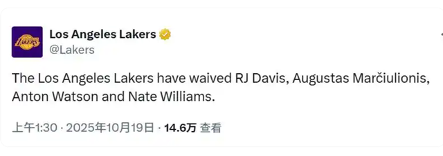 北京时间常规赛倒计时最后一天,洛杉矶湖人队再度官宣重磅消息:球队正式裁掉奥古斯塔斯·马尔丘利奥尼斯、RJ·戴维斯、内特·威廉姆斯、安东·沃森四名球员。这一操作标志着湖人新赛季阵容调整进入最终阶段,17人冲冠名单随之浮出水面。