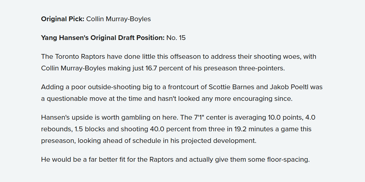 目前拥有9号签的多伦多猛龙队,在今年休赛期几乎未采取有效措施解决球队的投篮难题。他们原先在第9顺位选中的博伊尔,在季前赛中的三分球命中率仅为16.7%。在巴恩斯和珀尔特尔组成的前场阵容中,再加入一名外线投篮能力薄弱的大个子球员,这一决策本身就饱受争议。而从目前的情况来看,这一决策并未带来任何积极的转变。