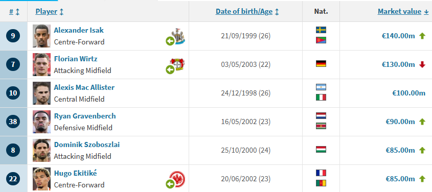 根据德国转会市场最新数据,经历夏窗大手笔引援后,利物浦全队总身价已达11.5亿欧元,位列五大联赛第四、英超第三。球队坐拥伊萨克(1.44亿欧)、维尔茨(1.25亿欧)、麦卡利斯特(1亿欧)三位「亿元先生」,赫拉芬贝赫、索博斯洛伊、埃基蒂克三人身价也均超过8000万欧元。