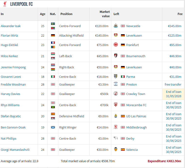 今夏转会市场,利物浦以4.83亿欧元总支出领跑五大联赛,维尔茨(1.25亿欧)与伊萨克(1.44亿欧)连续刷新队史转会费纪录,两人合计2.69亿欧元已超过曼联整个夏窗投入。埃基蒂克(9000万欧)、科尔克兹(4690万欧)、弗林蓬(4000万欧)等新援更凸显红军补强决心。