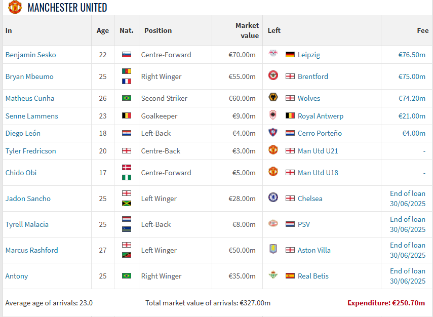 曼联虽在锋线进行全面升级,但引援策略明显更为保守。最贵的谢什科转会费7650万欧元,仅相当于伊萨克的一半。整个夏窗2.507亿欧元总支出,尚不及维尔茨与伊萨克两人转会费之和,这种投入差距直接反映在阵容深度上。