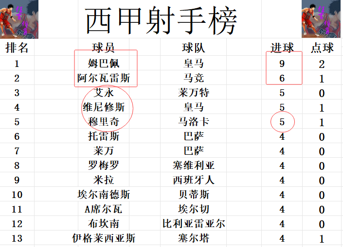 巴黎借将姆巴佩以9球稳居射手榜首位,阿尔瓦雷斯6球位列次席。穆里奇本轮破门后追平维尼修斯、艾永,三人同以5球并列第3。莱万因伤缺阵,但仍以4球与托雷斯、A席尔瓦、罗梅罗等人挤入前十。