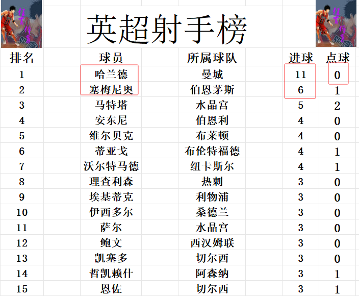 射手榜竞争愈发激烈,曼城锋霸哈兰德本轮梅开二度,8轮11球成为赛季首个进球上双的球员。塞梅尼奥6球位居次席,马特塔5球排在第4,维尔贝克、安东尼、蒂亚戈和沃尔特马德同以4球并列第4。阿森纳前锋哲凯赖什本轮未能破门,与埃基蒂克、恩佐等人同以3球挤入前十。