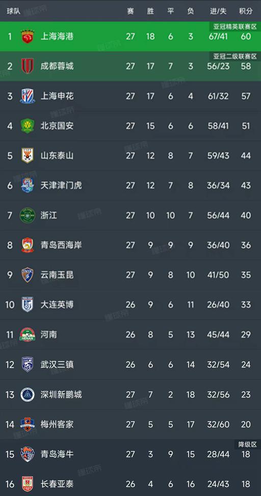 北京时间10月19日,中超联赛第27轮结束了6场焦点对决,积分榜再次迎来关键变动。争冠集团与保级区的竞争愈发激烈,本文将为您详细解析最新积分形势。