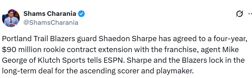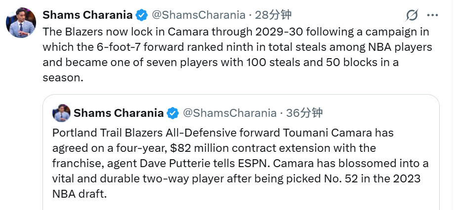 北京时间10月20日,篮球界传来重磅消息,中国球员杨瀚森的两位队友——谢登·夏普与塔马尼·卡马拉,同时与波特兰开拓者队达成高额续约协议。据权威媒体ESPN披露,夏普以4年9000万美元的合同提前锁定未来,而卡马拉则以4年8200万美元的价码紧随其后,两人续约总额高达1.72亿美元,引发联盟广泛关注。