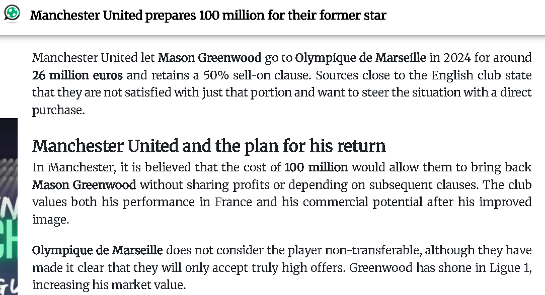 然而,青木的出色表现也引发了转会市场的波澜。西班牙「Fichajes转会网」迅速曝料称,曼联准备豪掷1亿欧元(8680万英镑)向马赛回购格林伍德。据该媒体透露,曼联在出售青木的合同中设有50%的转售条款,但俱乐部显然不满足于仅仅分成,他们希望重新拥有这位天才前锋。