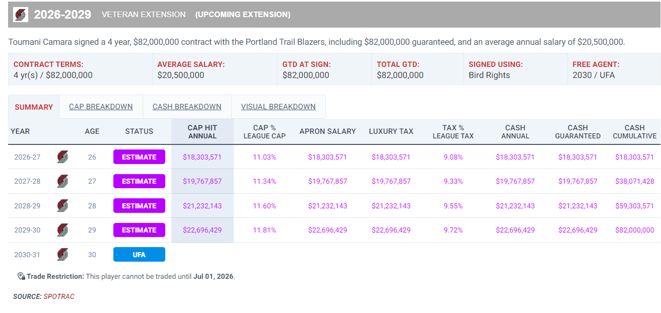 值得注意的是,卡马拉的新秀合同原本为四年763万美元。根据新续约合同,他2026-2027赛季的新秀合同薪资(原为240万美元)将被新合同取代,薪水跃升至1830万美元。随后三个赛季,他的薪资将逐年递增,分别为2027-2028赛季的1976万美元、2028-2029赛季的2123万美元以及2029-2030赛季的2269万美元。