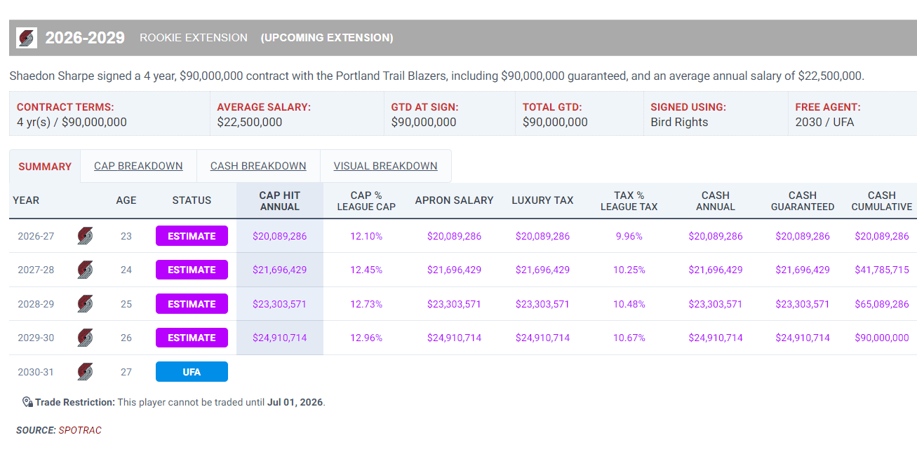 根据夏普的新合同,从2026-2027赛季开始,他的薪资将逐年递增,分别为第一年的2008万美元、2027-2028赛季的2169万美元、2028-2029赛季的2330万美元以及2029-2030赛季的2491万美元。