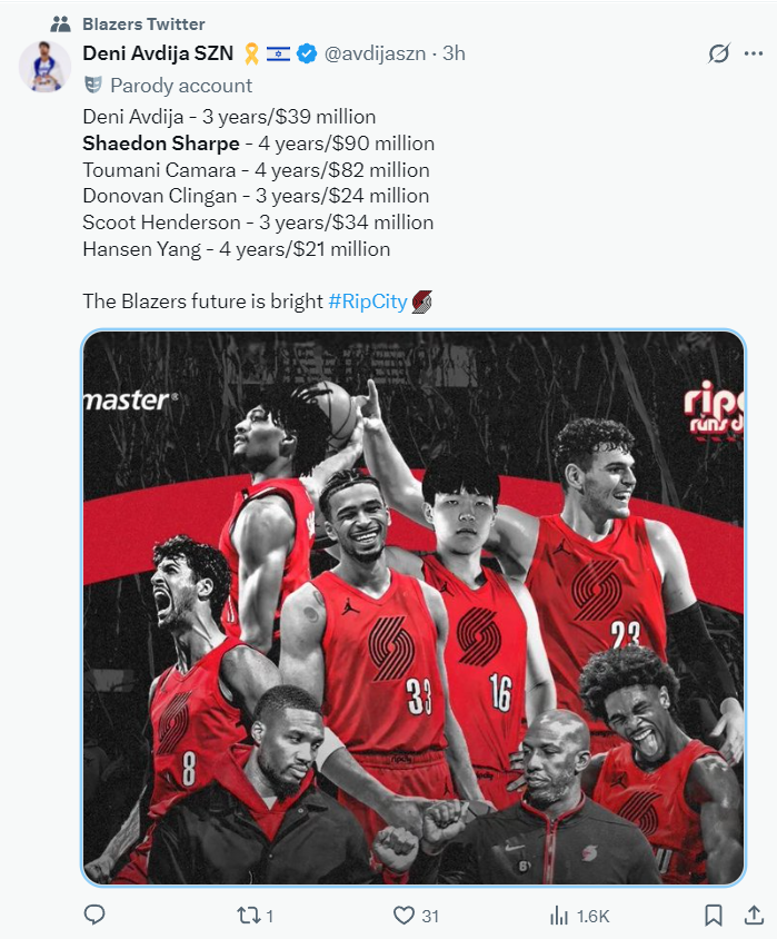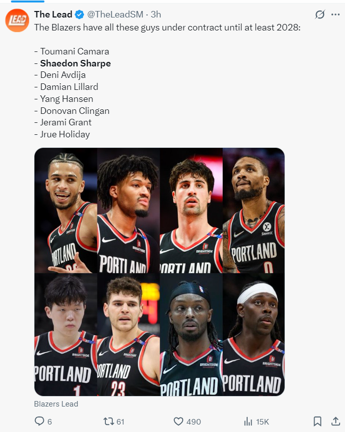 此外,拓媒还公布了开拓者队至少在2028年仍有效力的主要球员名单,包括卡马拉、夏普、阿夫迪亚、利拉德、杨瀚森、克林根、格兰特和霍勒迪。