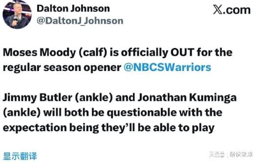 据记者道尔顿-约翰逊报道,勇士在揭幕战前就遭遇了重大打击。23岁的后卫摩西-穆迪因小腿受伤,已确定将缺席揭幕战。此外,两名锋线大将吉米-巴特勒和乔纳森-库明加也因脚踝扭伤而处于出战成疑的状态,这无疑给勇士的备战蒙上了一层阴影。
