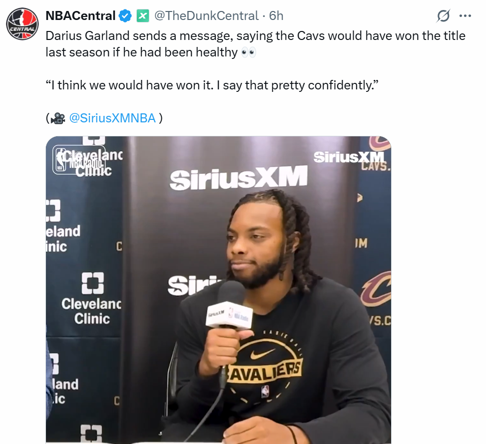 雷速体育10月20日讯,在近日的一次采访中,骑士队后卫达里厄斯·加兰(Darius Garland)谈到了上赛季球队的表现,并放出豪言:如果上赛季全员保持健康,骑士队完全有能力夺得总冠军。