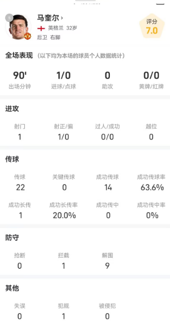 本场比赛,马奎尔在进攻端的表现堪称高效。他全场仅有1次打门,但正是这一次攻门,帮助红魔打入了制胜球。在传球方面,马奎尔也有着不俗的表现,他全场完成了22次传球,其中14次成功,传球成功率为63.6%。此外,他还送出了1次成功长传,长传成功率为20%。