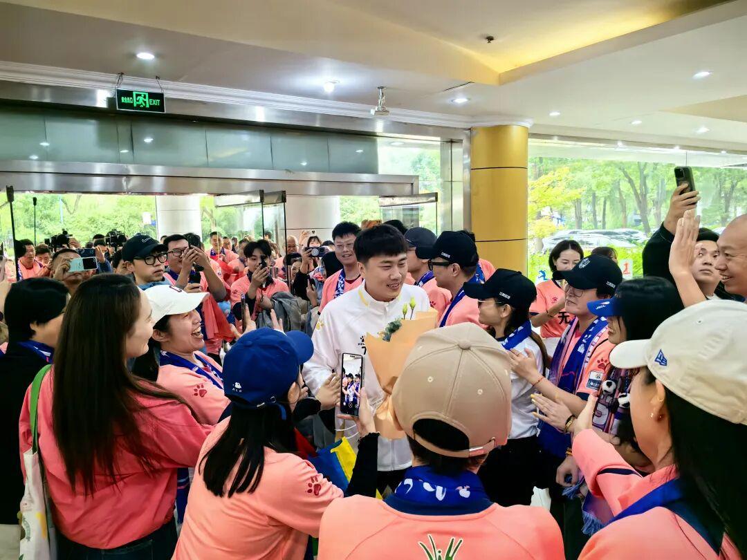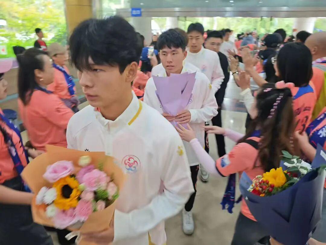 现场,球迷们挥舞着球队旗帜,高举标语牌,用最真挚的热情迎接归来的英雄。他们的欢呼声和掌声,为球队本赛季的征程画上了温暖的注脚。