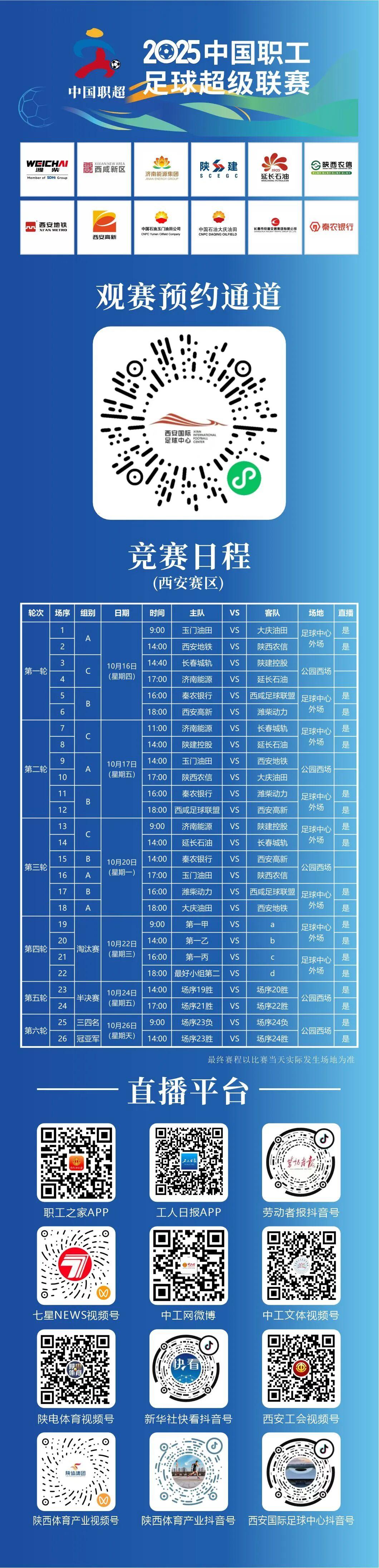 据悉,西安赛区汇聚了来自全国五省的12支不同行业、单位的职工球队,它们被分为三个小组展开激烈的角逐。在接下来的赛程中,包括总决赛在内的30场比赛将陆续上演,数百名中国职工足球的明星球员将为全国职工足球爱好者奉献一场场精彩绝伦的足球盛宴。