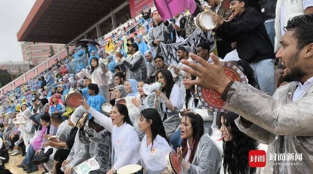 来自摩洛哥的留学生安静(中文名)是助威团的“领喊员”。他举着小喇叭,用英语、法语教大家喊中文“加油”和四川话“雄起”,还现学现卖网络热梗,带动全场欢呼。他笑着说:“我们听不懂战术,但要用热情感染每一个人!”