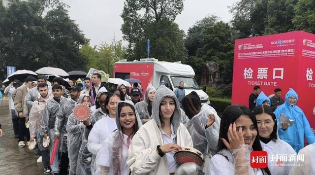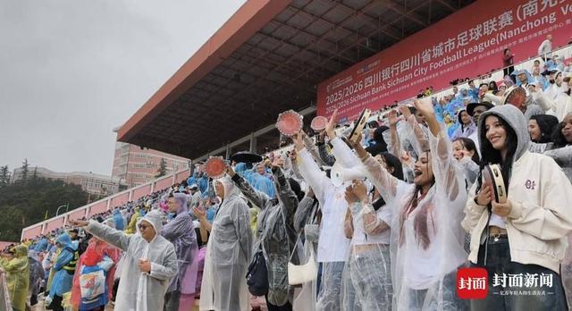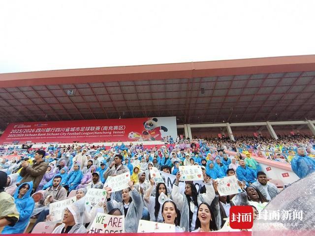 当日秋雨绵绵,球迷们身着雨衣入场,成为一道亮丽风景线。检票口处,这支“外国球迷队”手持手鼓、腰鼓等乐器,有序走向看台。比赛前,非遗表演让他们兴奋不已;比赛中,每当南充队进攻,他们便用各国语言齐喊“Fighting!”“Bravo!”,甚至跟着网络热梗高呼“南充加油,干翻成都!”。