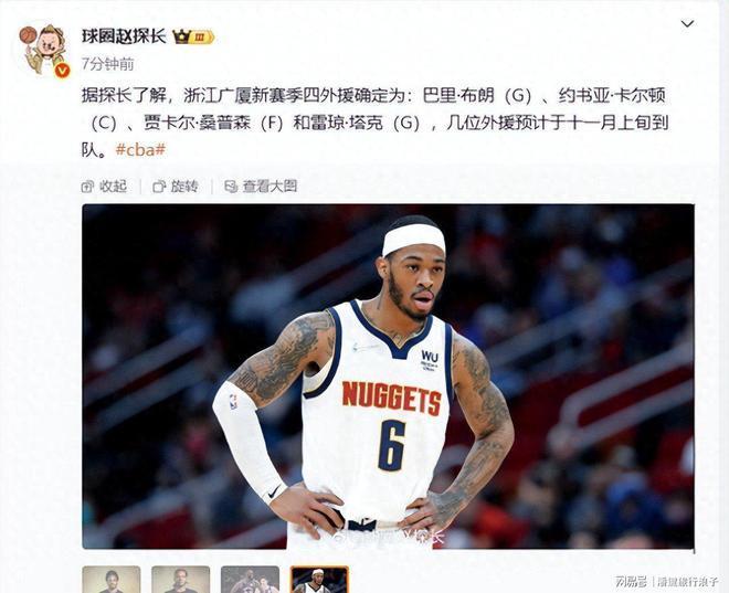 据媒体人“球圈赵探长”最新报道,浙江广厦已确定新赛季四名外援人选,分别为巴里-布朗、约书亚-卡尔顿、贾卡尔-桑普森和雷琼-塔克。这四名外援预计将于11月上旬抵达球队,与广厦男篮完成集结。