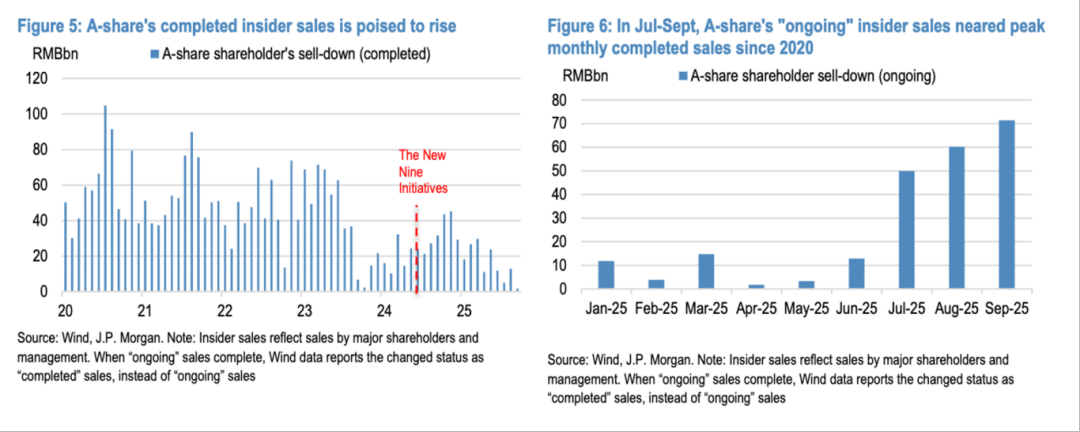 2.A股内部人士(含大股东和管理层)的潜在减持意愿在第三季度激增,8月和9月进行中(已公告未完成)的减持计划规模分别攀升至600亿和超700亿元人民币。这一积压的抛售规模已非常庞大,其水平已接近2020-2021年间月度减持的历史峰值(600-800亿元)。