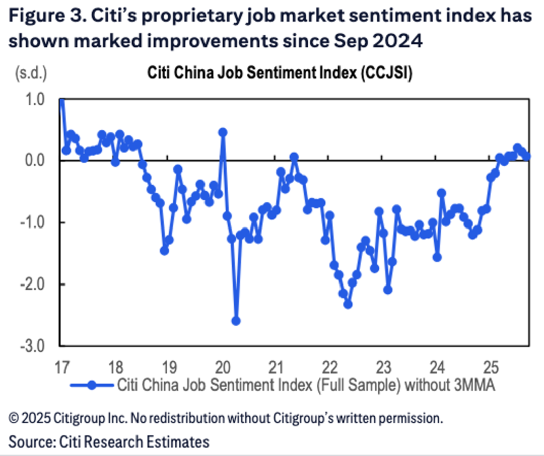 4.中国就业市场景气度已显著改善,花旗编制的中国就业市场情绪指数(CCJSI)自2024年9月以来持续回升,已从约-1.0个标准差的低位攀升至2025年中的0以上,达到了疫情后的最高水平。这一积极趋势也从其他方面得到了佐证:今年迄今,与“求职”和“失业”相关的网络搜索热度已呈下降趋势,并低于历史平均水平。