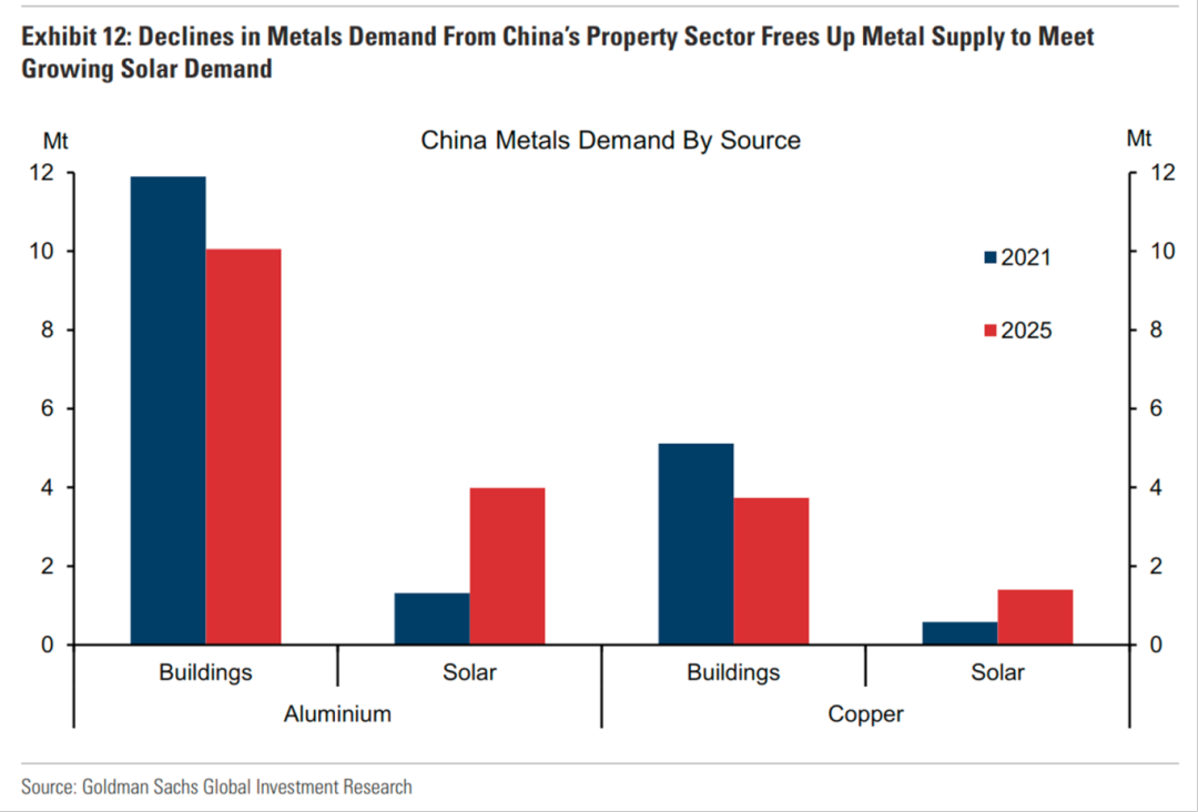 5.中国房地产行业的需求降温正在为快速增长的太阳能行业释放关键的金属供应。预计2025年全年,中国建筑业对铝的需求将从2021年的约1180万吨降至1000万吨,同期对铜的需求将从510万吨降至370万吨。与此形成鲜明对比的是,太阳能行业的需求大幅增长,对铝的需求同期从130万吨增长约两倍至390万吨,对铜的需求也从60万吨增长超过一倍至140万吨。