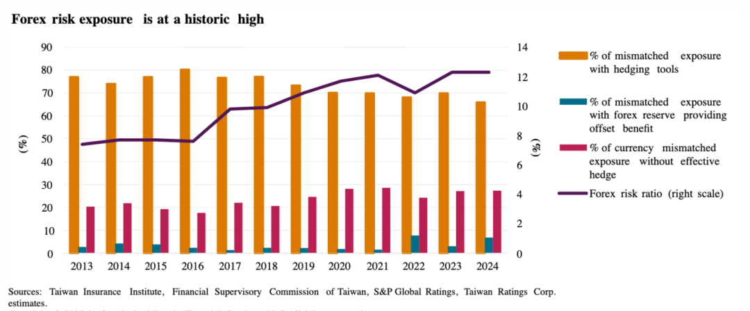 7.台湾寿险公司的外汇风险敞口正处于历史高位,其外汇风险比率已从2017年的约9.8%攀升至2023年的12.5%。此风险源于台湾寿险业在亚太地区最高的外币投资配置(主要是美元债券),用以匹配其长久期负债,但这造成了巨大的货币错配。尽管大部分风险通过对冲工具管理,但未有效对冲的错配敞口已从2017年的约18%扩大至2024年的约27%。