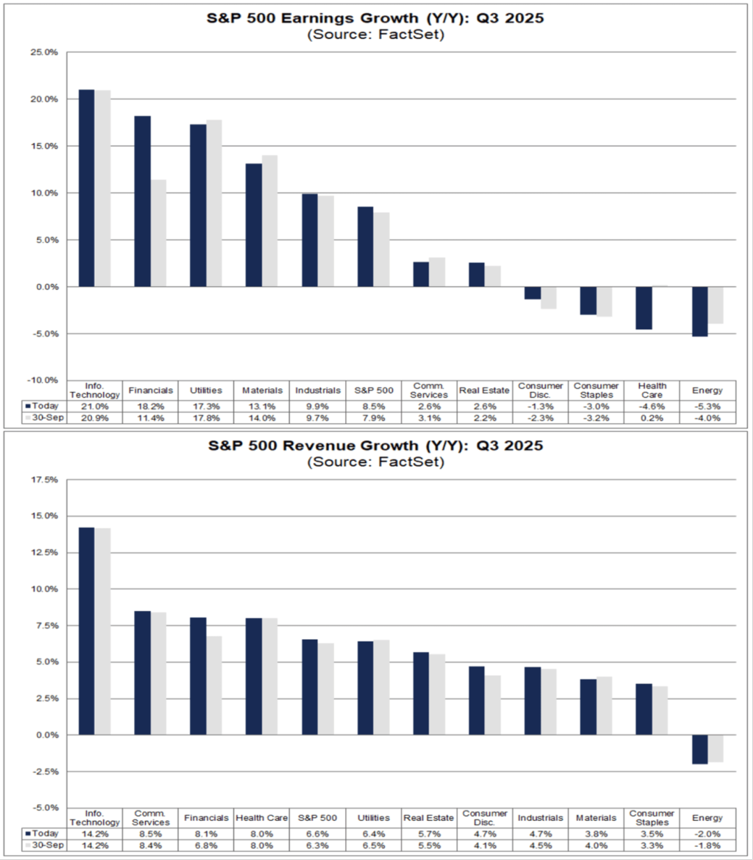 1.截至目前,标普500指数中已有约12%的公司公布2025年第三季度财报,结合已披露业绩与未发布企业市场预期的混合每股收益(EPS)同比增长8.5%,营收同比增长6.6%,均好于9月底时的预估。分行业看,信息技术和通信服务板块在营收端表现最强,分别增长14.2%和8.5%;盈利方面则由信息技术和金融板块领跑,分别上升21.0%和18.2%。、