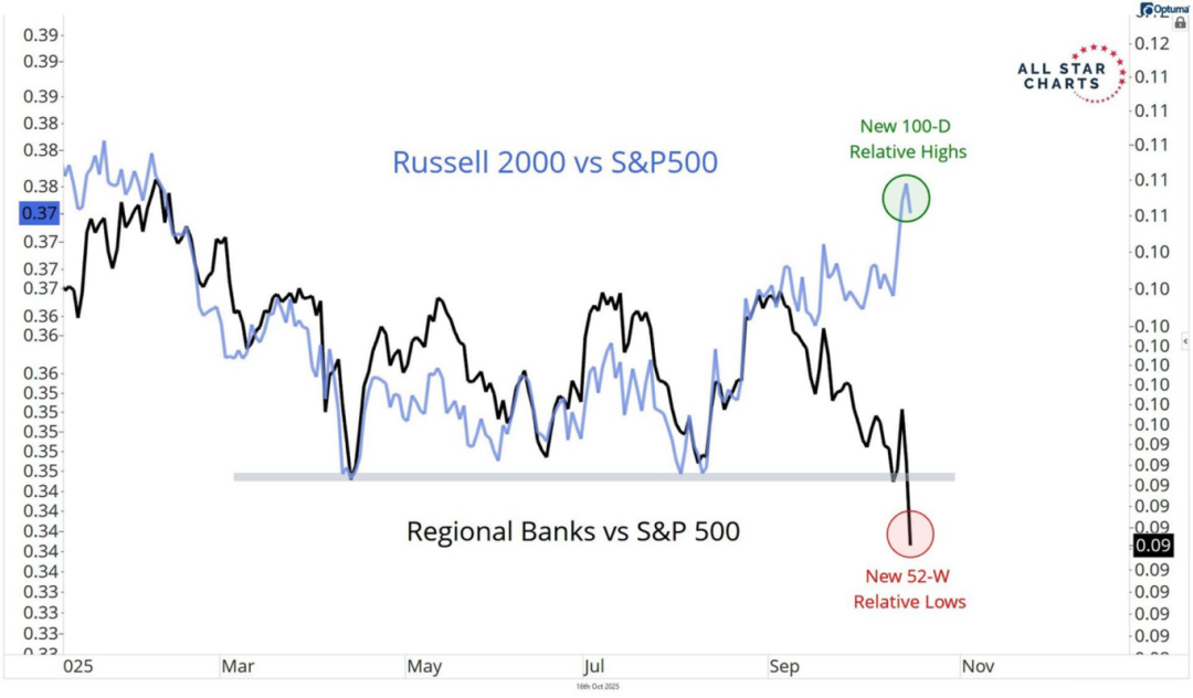 2.罗素2000指数与区域性银行的表现正出现极端分化,区域性银行相对于标普500的比率在2025年10月创下52周新低,而罗素2000指数相对标普500的比率却同时创下100日新高。这种背离值得警惕,因为区域性银行是罗素2000指数中最大的组成部分,权重高达10%。如果占比如此之大的银行板块持续下跌,将对小盘股指数的上涨势头构成重大阻力。