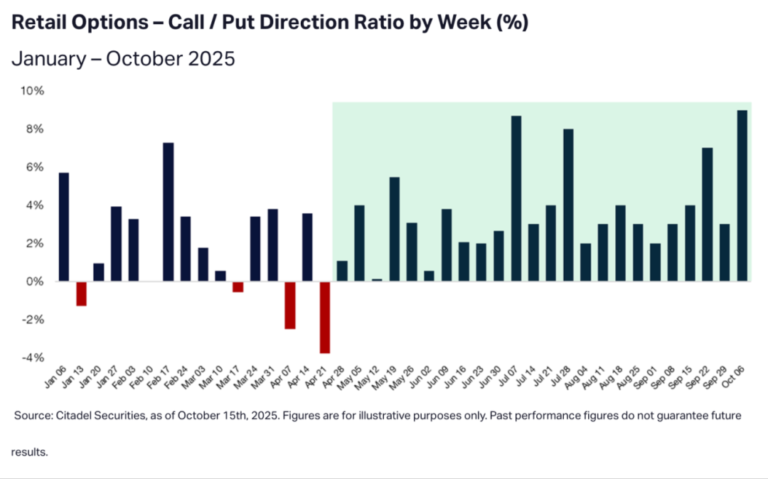 3.根据Citadel Securities的数据,散户投资者的期权看涨/看跌方向倾向已连续24周保持正值,追平该平台历史上最长的净看涨周期纪录,并在10月首周升至约9%的阶段性高点。