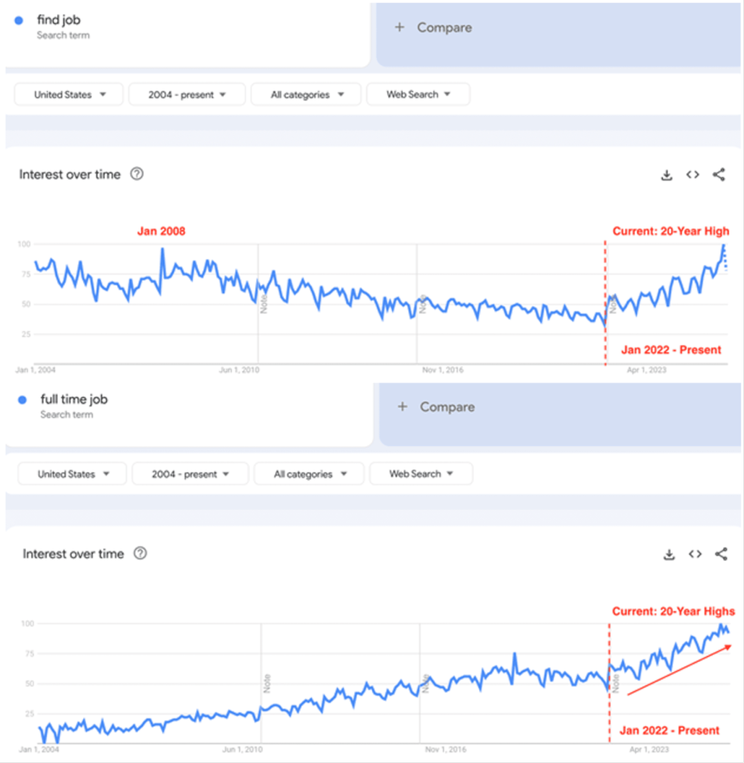 4.美国就业市场的焦虑情绪正急剧升温,谷歌趋势显示,对“find job”(找工作)和“full time job”(全职工作)的搜索热度已飙升至20年来的最高点,其水平已超过2008年金融危机期间。目前的低失业率依赖于企业尚未大幅裁员,但这种平衡非常脆弱:一旦裁员潮启动,劳动力市场中大量已在积极寻找工作的美国人将迅速推高失业率。