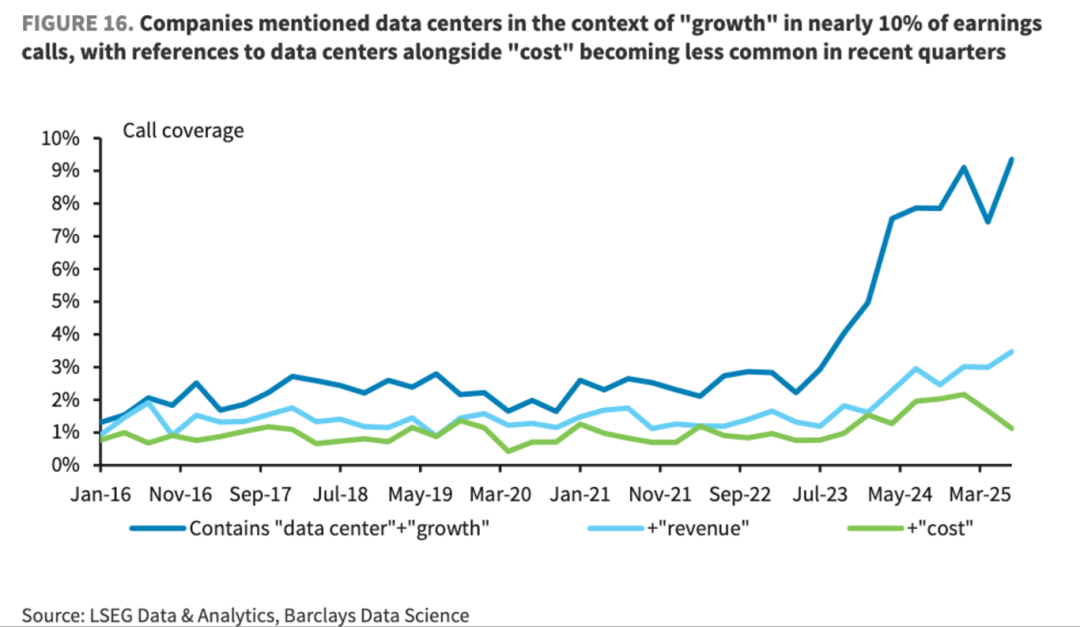 5.虽然美国市场上巨额的资本开支由少数超大规模云服务商承担,但这笔支出直接转化为硬件、能源及建筑等众多供应商的收入与增长动力。这就在市场上形成了一种非对称效应:经济利益被广泛分散,而成本风险则高度集中,从而使这些科技巨头的资本支出意愿成为整个AI产业链的关键命脉。这一机制在企业财报会议的语言中得到印证:提及“数据中心”与“增长”的频率已飙升至近10%,而与“成本”的关联则日益减少。