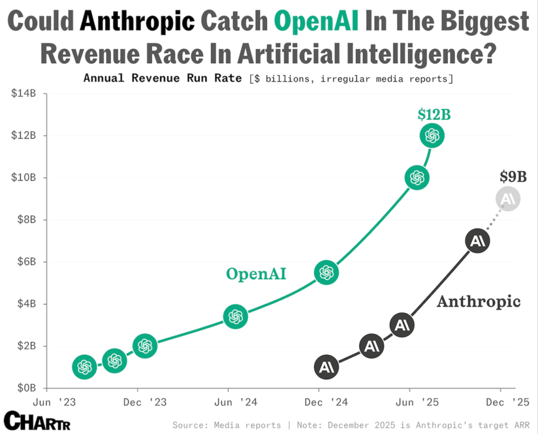6.人工智能领域的收入竞赛正在升温,OpenAI在2025年7月下旬的年收入运行率(ARR)据报达到120亿美元,而其竞争对手Anthropic在10月份也达到了70亿美元。尽管OpenAI凭借5000亿美元的估值远超Anthropic的1830亿美元,但Anthropic正迅速追赶,并据报道计划将其2026年的收入目标提高至近260亿美元。