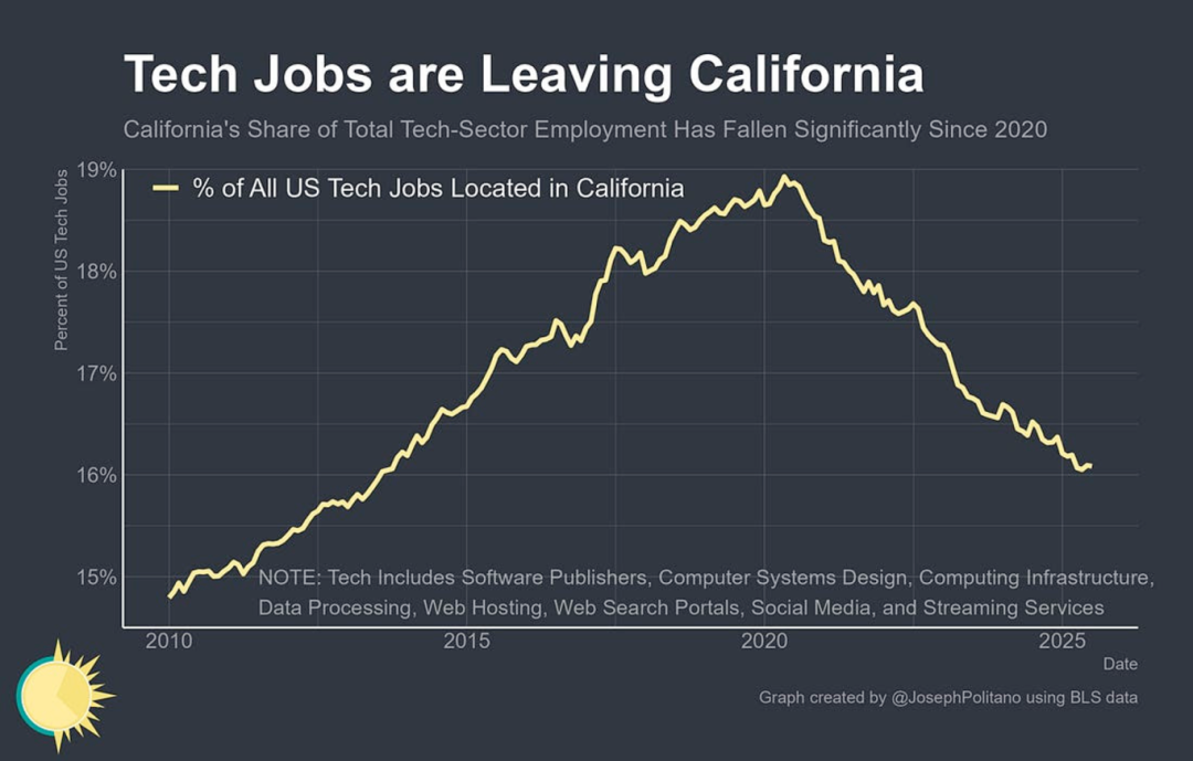 7.加利福尼亚州作为美国科技中心的地位正被削弱,其占全美科技岗位的份额已从2020年近19%的峰值大幅降至2025年的约16%。