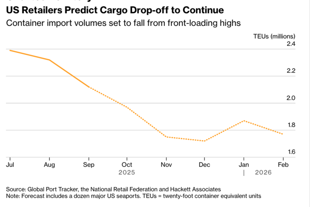 8.美国主要海港9月集装箱进口量自7月约235万标准箱(TEU)的高点持续下滑,Global Port Tracker预计年底将降至约170万TEU,2026年初虽短暂回升但随后再度转弱。