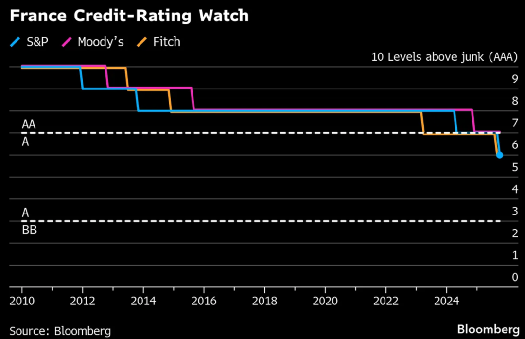 2.标普全球在一次非预定行动中将法国主权信用评级从AA-下调至A+(距垃圾级6级),这是法国自2010年以来首次在三大评级机构处均失去“双A”评级地位。此次降级延续了法国自2012年以来的信用恶化趋势,标普将其归因于法国政府在政治僵局下面临的“持续加剧的”预算不确定性。该少数党政府近期为在不信任投票中幸存,被迫暂停了旨在巩固公共财政的养老金改革。这种不稳定性使外界对其财政目标产生怀疑:尽管政府力求在2026年将赤字率从5.4%降至4.7%,但标普预测赤字率仅会微降至5.3%。