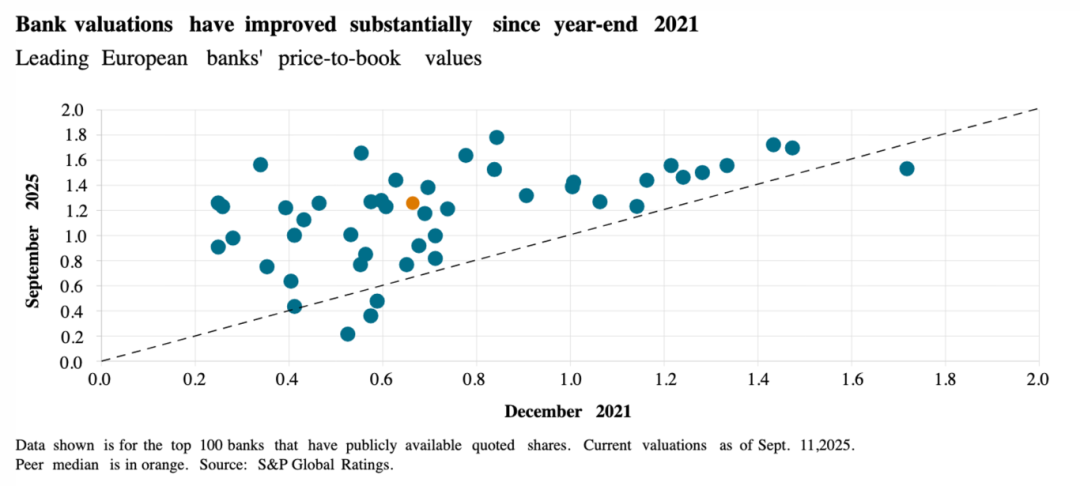 3.欧洲银行的估值自2021年底以来已大幅改善,目前34家主要上市银行的市净率(P/B)超过1.0倍,而四年前仅有13家。这种强劲的估值修复,叠加银行持有的更多闲置资本,正激励银行业继续进行并购交易,以寻求通过整合实现规模效益。