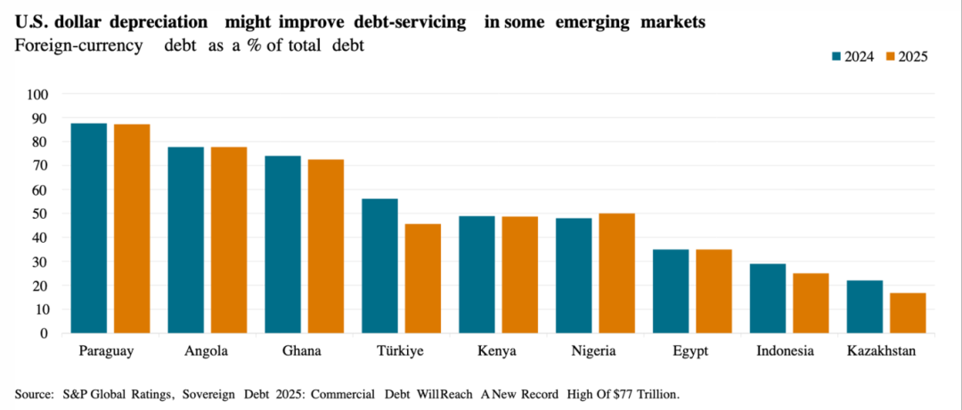 美元贬值预计将改善那些持有大量美元债务的新兴市场主权国家的近期偿债能力。这些国家的外币债务占总债务的比例普遍较高,其中巴拉圭(约87%)、安哥拉(约78%)和加纳(约72%)在2025年的敞口最大。然而,由于中部非洲法郎区的国家其外部债务更多以欧元计价,美元贬值给它们带来的好处可能不太明显。