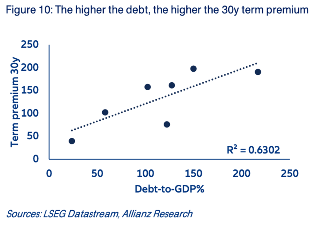 1.一个国家的主权债务水平是其长期融资成本的核心决定因素,更高的债务与GDP之比会系统性地迫使投资者要求更高的风险补偿(期限溢价),两者间存在高达0.63的强正相关性。