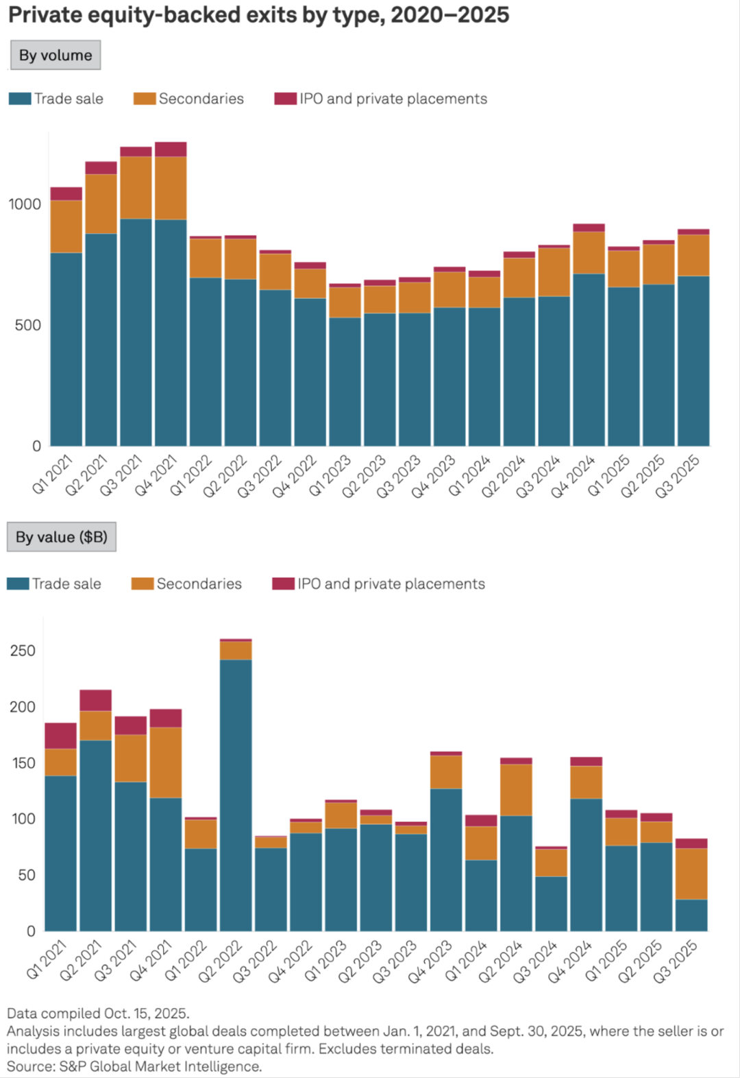2.2025年第三季度,全球私募股权与风险资本(PE/VC)的退出数量环比增长5%至898起,为2021年第四季度以来的次高水平;然而,退出总金额环比大幅下降22%至826.1亿美元。这种量价背离导致平均退出回报收缩,尤其是并购退出的回报率已低于四年平均水平。