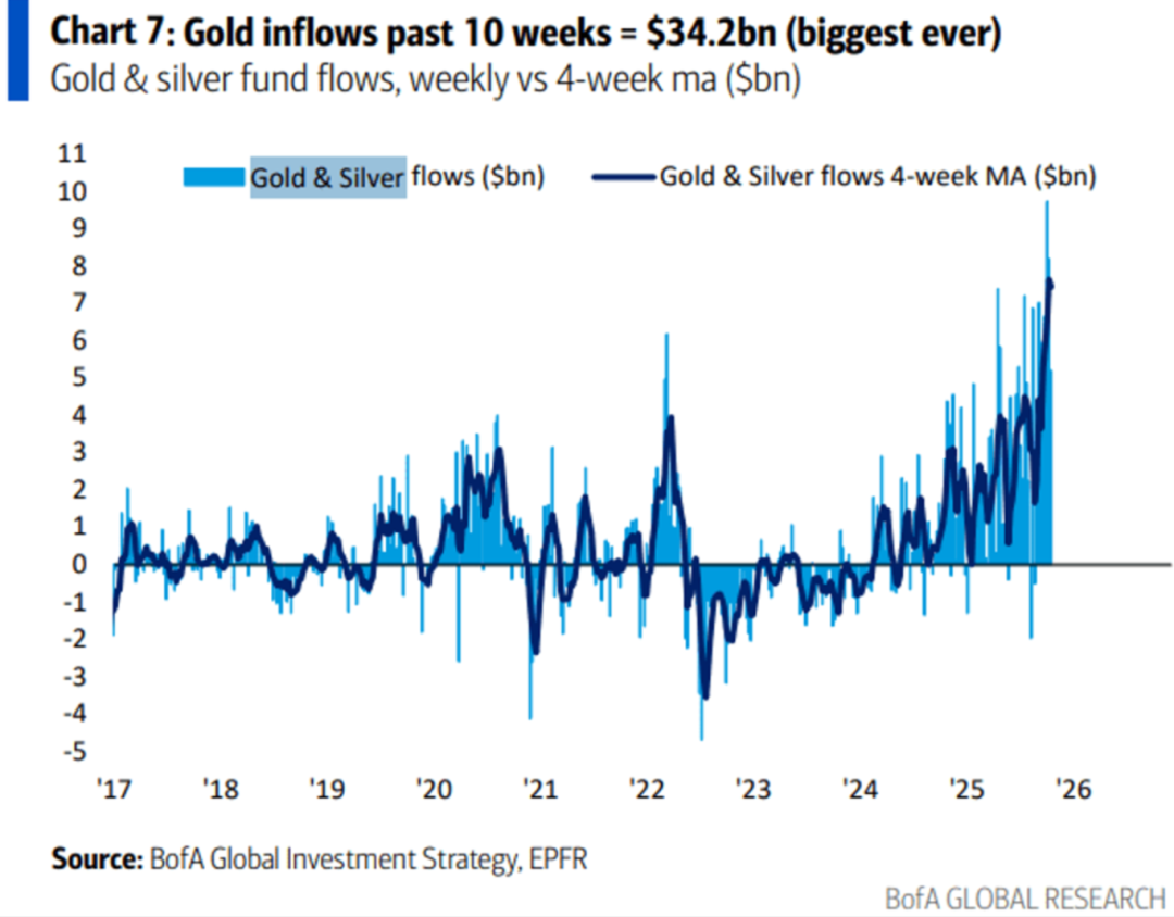 黄金基金在过去10周吸引了342亿美元的资金净流入,创下历史最高记录。