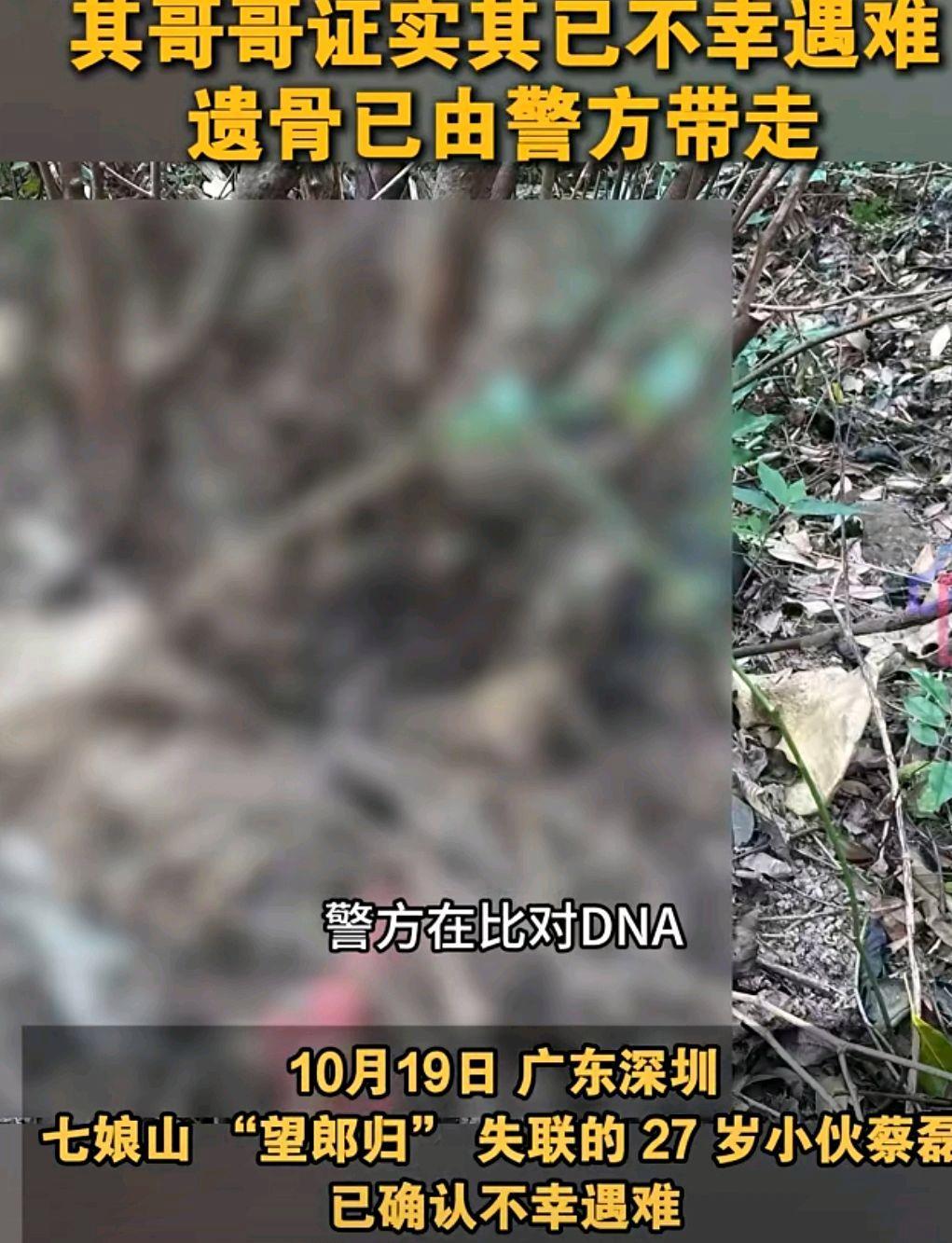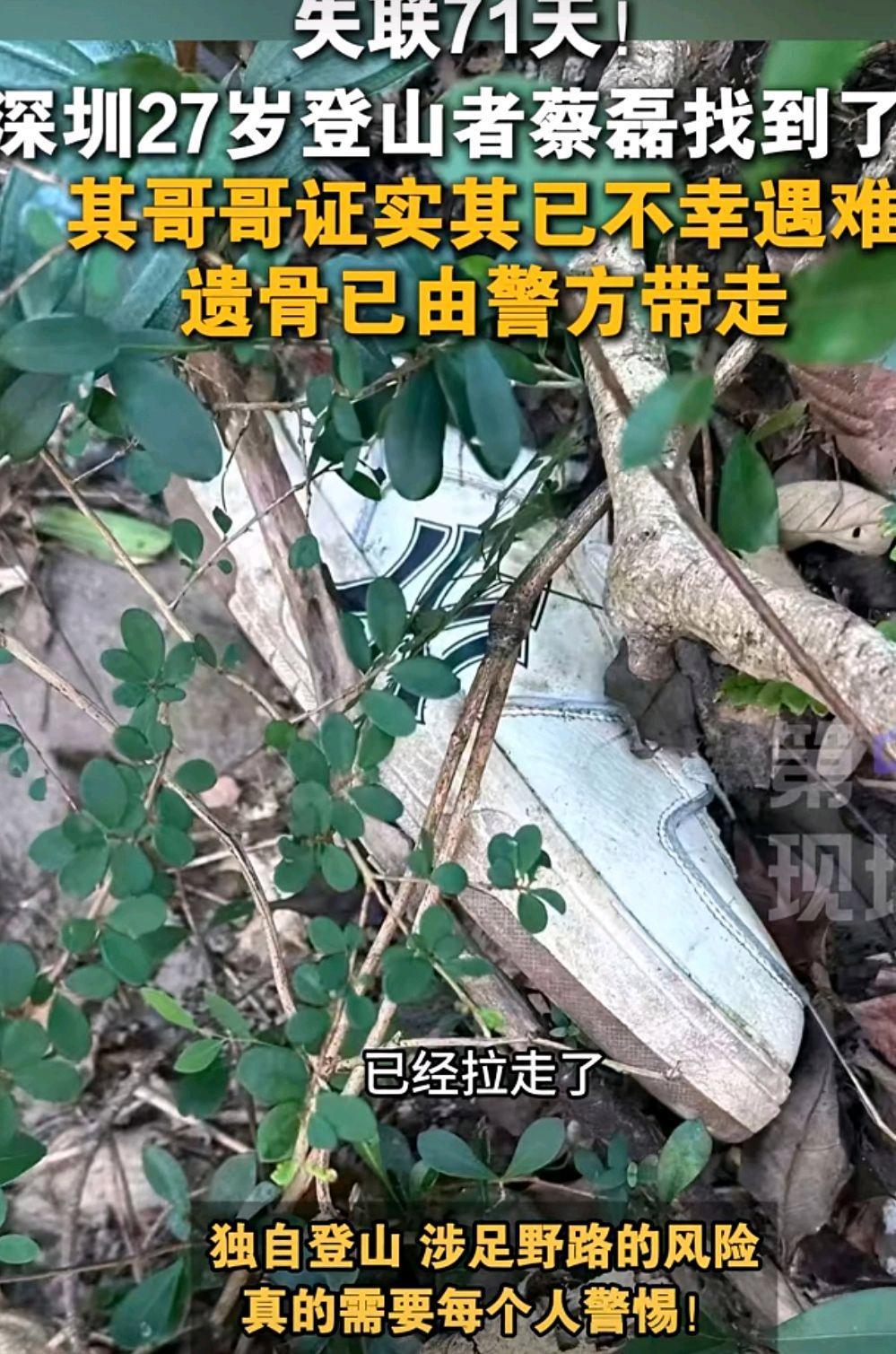 10月19日,深圳当地传来一则令人痛心的消息:8月10日独自攀登七娘山望郎归的27岁贵州小伙蔡磊,在失联71天后终于被找到,但遗憾的是,他已经变成了一具遗骨。蔡磊的哥哥确认,除了手机外,其他衣物、鞋子等物品均已找到,基本可以确认就是他。