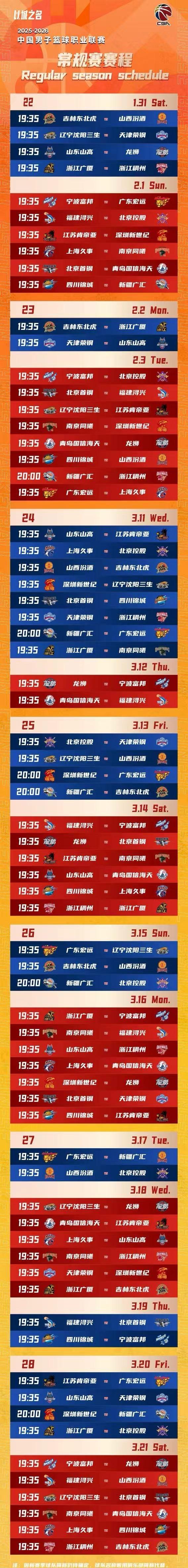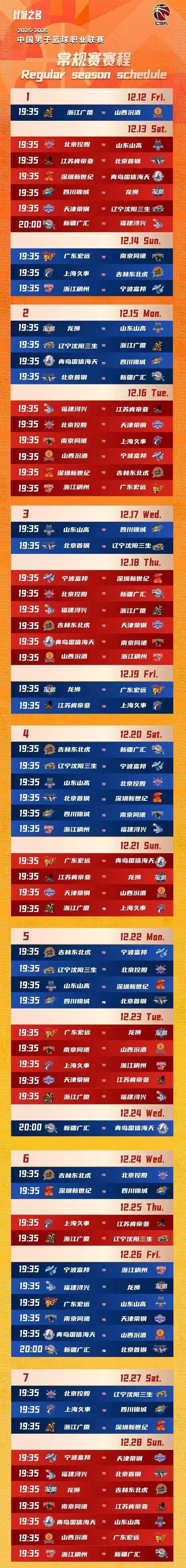北京时间10月20日,中国篮球职业联赛(CBA)正式公布了2025-26赛季的常规赛赛程安排。本赛季常规赛将进行42轮比赛,时间跨度从2025年12月12日至2026年4月24日。其中,备受瞩目的揭幕战将于12月12日19:35打响,由卫冕冠军广厦队对阵山西队,这场对决也是上赛季常规赛前两名球队的再次交锋。