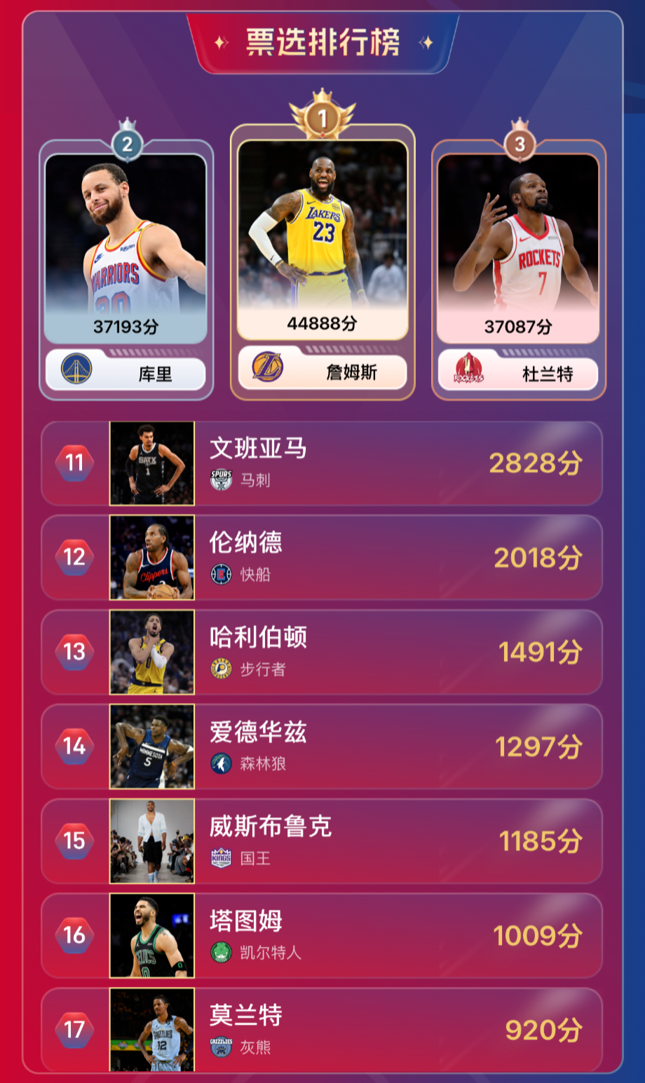 经过一番激烈的角逐,湖人队的超级巨星勒布朗·詹姆斯以惊人的44888分高居榜首,毫无悬念地获得了“雷速人气王”的殊荣。让我们用热烈的掌声向他表示祝贺!