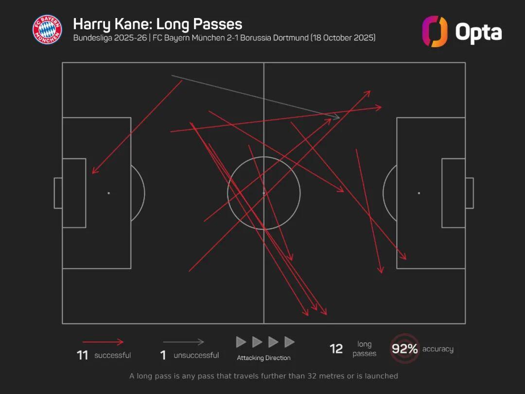 尽管雅克松、奥利塞等边锋受国家队比赛影响状态平平,但凯恩的体能与竞技状态明显更优。赛后被问及位置时,他笑称:“今天我踢的是中场,也许是6号、8号和10号。”全场数据印证其全能性:触球62次、25次对抗成功率60%、44次传球成功率82%、跑动11.6公里(队内第三),更以11次成功长传(32米以上)创德甲纪录,其中7次从左传向右前方。