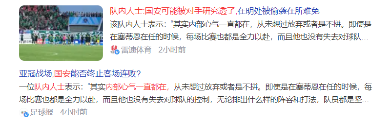 其中一位队内人士透露,北京国安内部的心气一直都在,从未想过放弃或者是不拼。即使塞蒂恩在队时,每场比赛也是全力以赴。该人士还同时表示,北京国安之所以变成现在这样,可能是已经被对手研究透了,被针对了。因为北京国安以前都是以我为主,但是现在北京国安在明处,而对手则是在暗处,所以难免被偷袭。