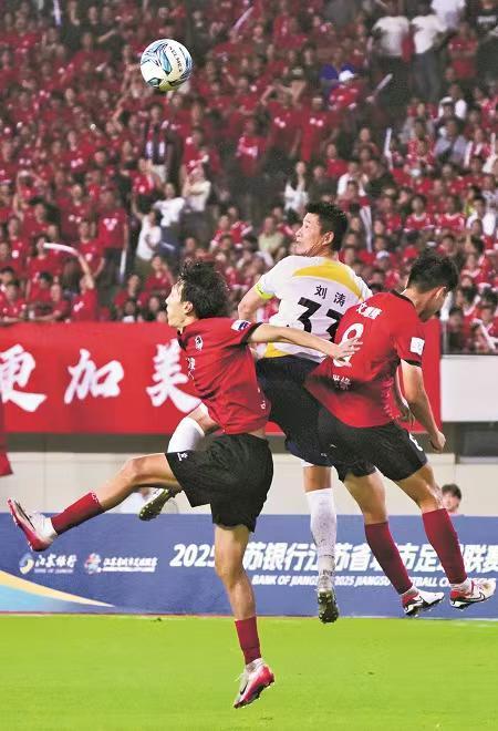苏超赛场激烈拼杀瞬间(工人日报记者刘金梦 摄)