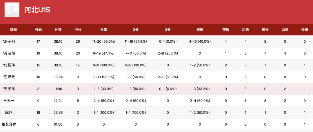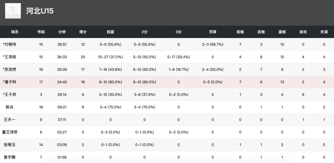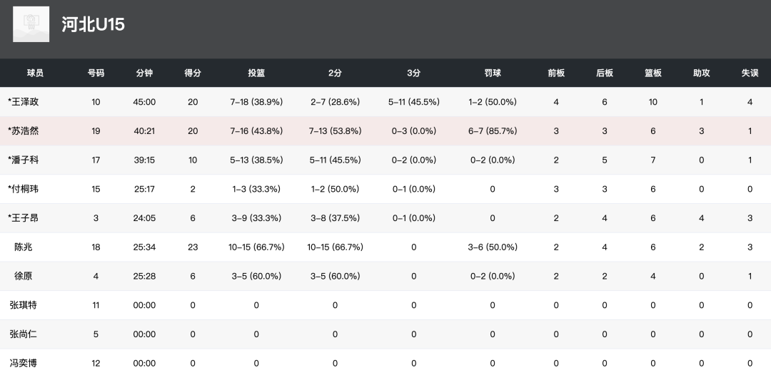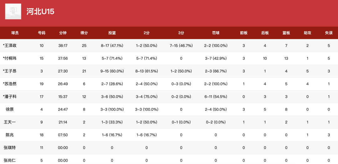 在预赛阶段,小将付桐玮场均贡献11.8分10篮板的两双数据,成为球队内线的稳定得分点。而另一名小将苏浩然则更加全面,场均可以贡献17.7分6.8篮板3.3助攻2.8抢断,是球队攻防两端的核心人物。