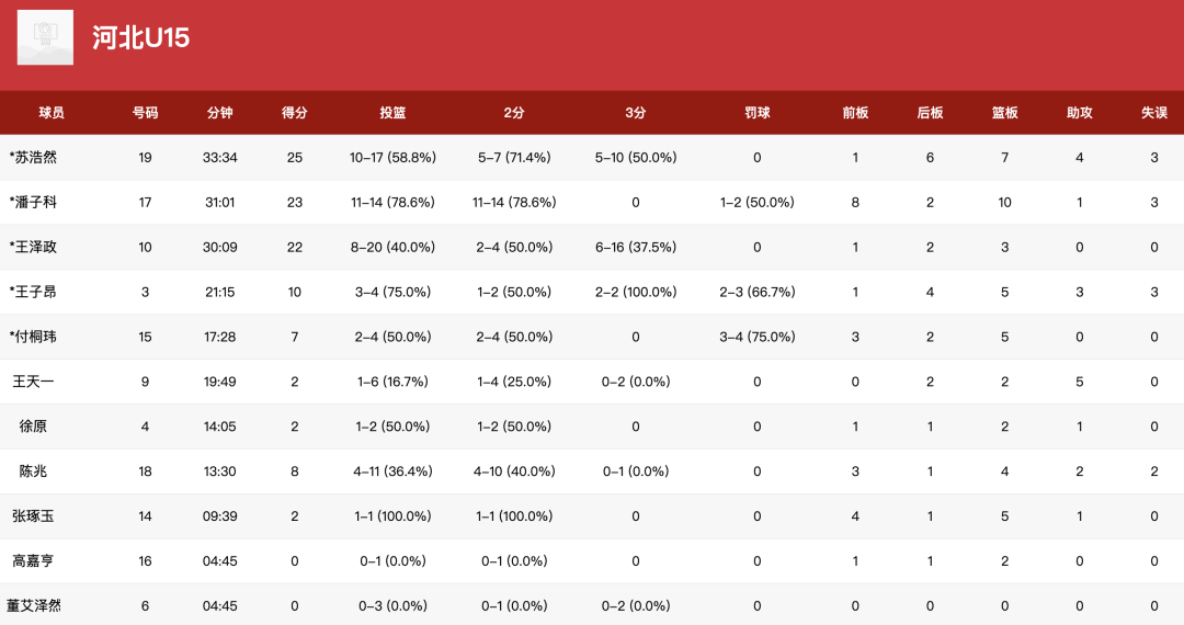 河北U15 85-63 北京首钢:河北U15在防守端表现出色,成功限制对手得分,晋级决赛。