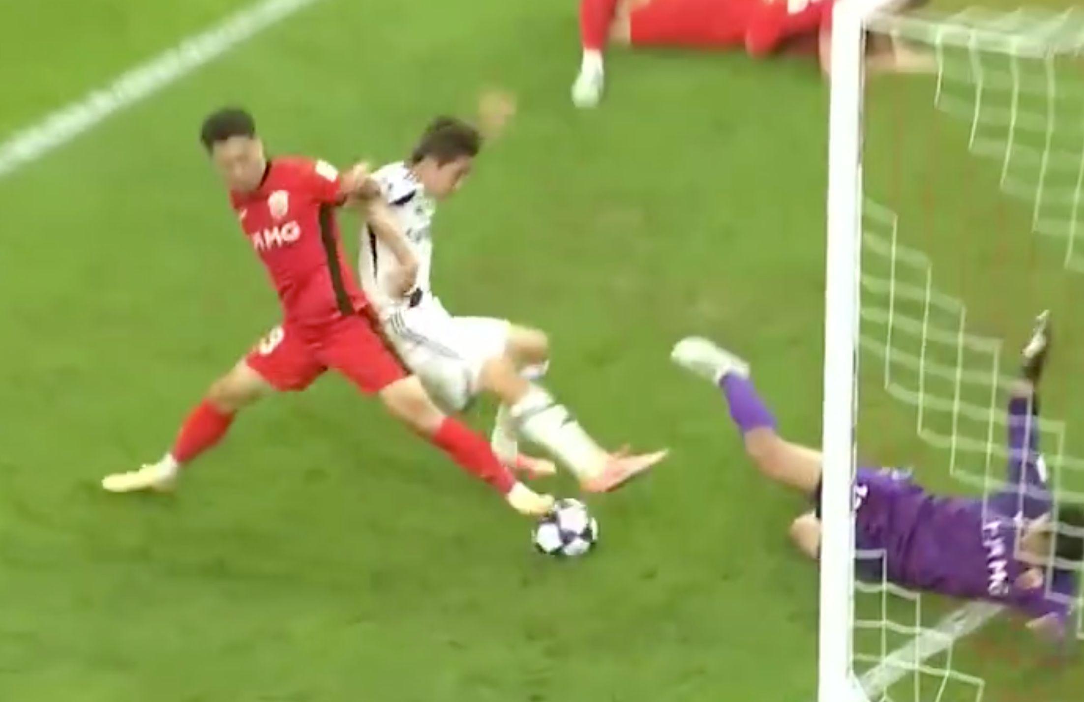 在大禁区弧顶处,相马勇纪在防守球员上抢之前大力射门,皮球打在魏震背部后发生变向。门将判断失误,只能目送皮球入网。海港0-2落后,比赛形势急转直下。